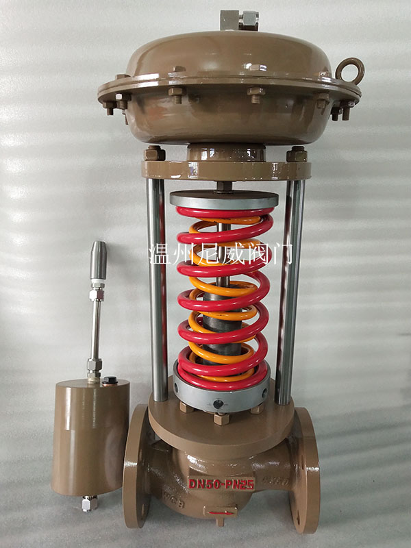 当介质流体从阀前流过经过阀芯阀座节流后,转化为阀后压力。然后经过管线输入上腔室作用在顶部的托盘上,这时产生的作用力会与弹簧的反作用力相对等。这样就决定了阀芯阀座的相对位置,从而控制阀后压力。当阀后压力增加时作用在顶盘上的作用力也随之增加,使阀芯关关向阀座的位置,这样阀芯和阀座之间的间隔就减小,流阻变大阀后压力降低。直到顶盘上的作用力与弹簧反作用力相平衡为止,从而使阀后压力下降到预设值。当阀后压力降低时,作用方向与之前所说相反,这就是自力式调节阀的工作流程了。
